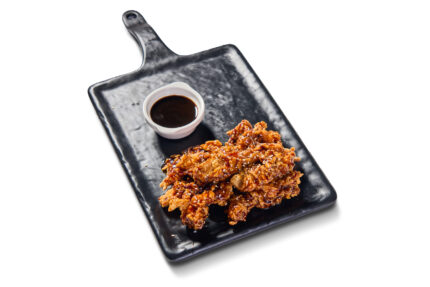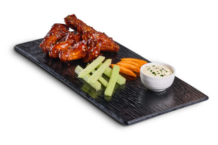 150-160 grams of chicken strips glaze on buttered spice with potato wedges & ranch sauce on the side